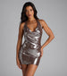 This metallic mini dress is ready for a night of dancing! Show off your moves out on the dance floor in this sleeveless dress featuring a sultry cowl halter neckline and a sassy bodycon silhouette. Pair with earrings and heels.