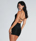 You plus this mini dress equals a good time! The short dress features a square neckline, velvet spaghetti straps, an open strappy back design, a flattering bodycon silhouette, and a mini-length hem on mesh fabric showcasing a velvet burnout geometric pattern. Complete the look with earrings and lace-up heels for a night out.