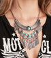 Give off dreamy bohemian vibes with this trendy statement necklace that is a stylish staple for festival season! It features a single chain leading to a layered design with a curved metal accent with a center turquoise stone and feather-shaped fringe, and a scalloped metal accent with turquoise stones, rhinestones, and longer feather-shaped fringe. Complete the look with a panama hat and ankle booties.