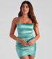 You'll look so dreamy in this sleek satin mini dress. It features a sleeveless square neckline, spaghetti straps, an open back with a lower back dual strap design, front ruching, and a short, curve-hugging silhouette with a wrap-front hem. Style this dress with clear heels.