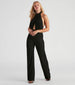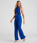 Let this sultry jumpsuit do the talking! Dress to impress in this sleeveless texture knit jumpsuit featuring a halter mock neck, open-back, front keyhole cutout, and a wide-leg silhouette. Complete the look with rhinestone hoop earrings.