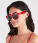 Give your summer 'fits an edgy flair with these cool shades. The sunglasses feature a flat top square-shaped design, a plastic frame with metal geometric accents on each side, and tinted lenses. Style with a cropped denim jacket.