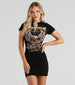 Show off an edgy style with this on-trend graphic t-shirt dress! It features a crew neckline with a notched design with safety pin detailing, short sleeves, a mini-length, fitted silhouette, and a motorcycle and eagle graphic with the script 'American Motorcycles Road Lifestyle 1974.' Complete your 'fit with combat boots.