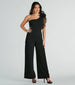 A one-shoulder crepe jumpsuit that makes you look like you've stepped out of the pages of a fashion magazine! It features a sleeveless design with a chic organza ruffled shoulder strap, a fitted bodice, and a flattering wide-leg silhouette on crepe knit fabric. Complete the look in stiletto heels for a dinner party or dressy occasion!
