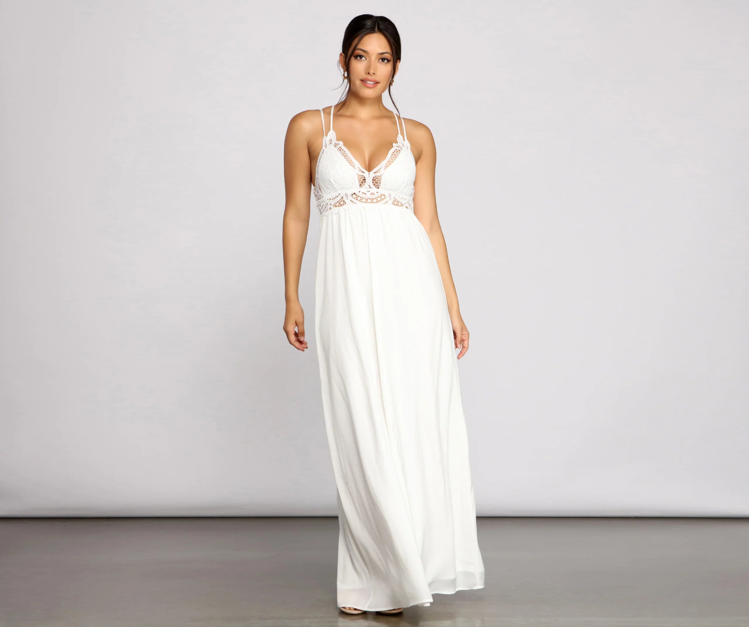 Create an effortless and pretty look with this flowy woven maxi dress! It features dual adjustable spaghetti straps that lead to a cross-back design, a sheer detailed lace bust with lined cups, a V neckline, and a floor-sweeping silhouette. Complete the outfit with hoop earrings and strappy sandals.