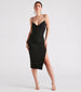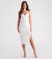Effortless and romantic, this sleeveless midi dress is a staple to have for every occasion! It features a V-neckline with a twisted bust, spaghetti straps, a form-hugging silhouette, and a sultry front slit. The mid-length dress is stretchy and double-lined. Complete the look in rhinestone mules.