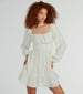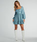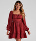 You'll look effortlessly stylish this season in this lightweight and flowy linen dress! Designed with a breezy woven fabric, this short dress is perfect for your summer parties. The bodice is shaped with a square neckline with ruching at the bust and long balloon sleeves. The fitted waistband creates a cinched silhouette, flowing out to a short ruffled hem with an A-line fit for a pretty flair. Complete the look with clear heels.