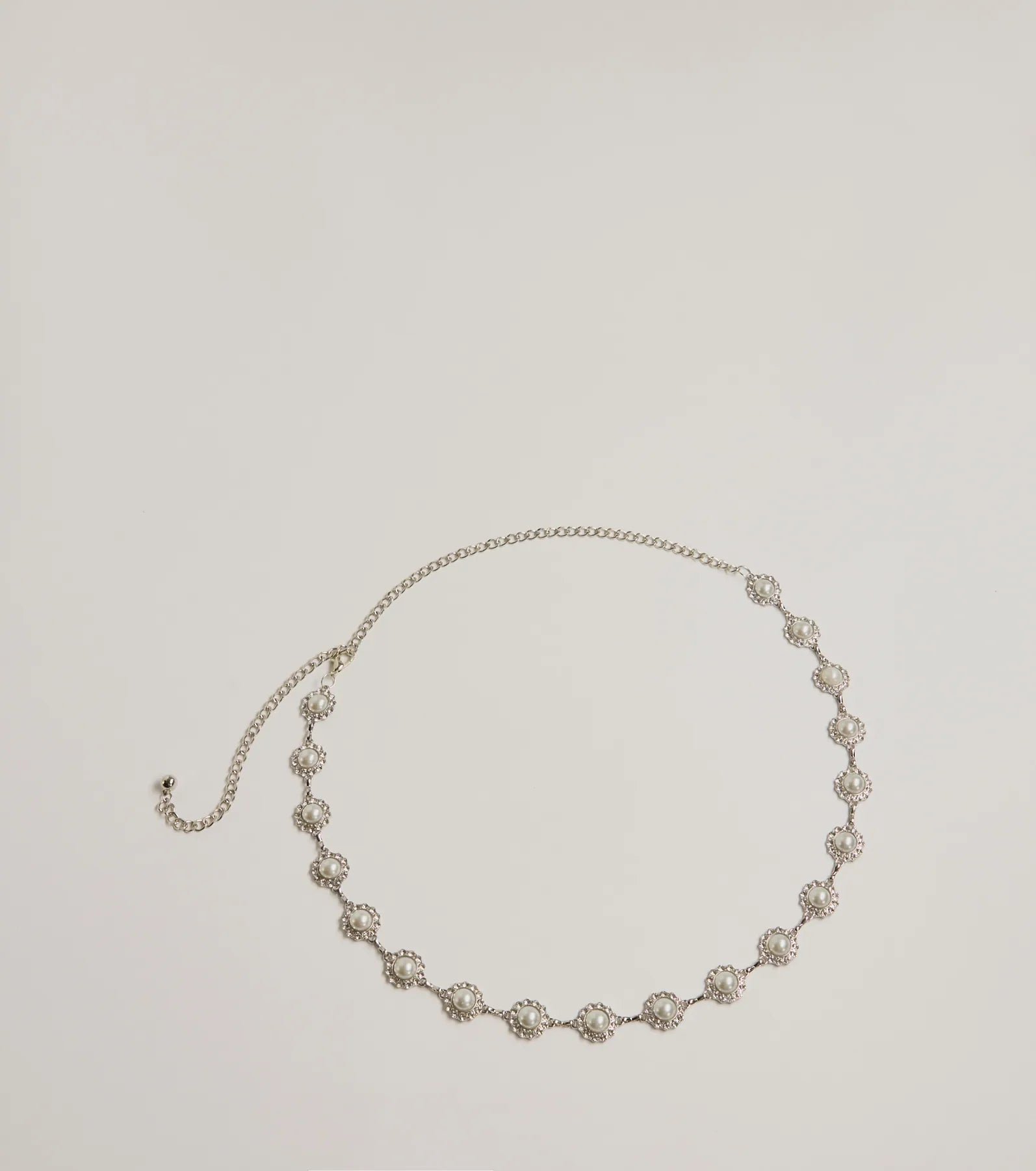 Elevate your chic outfits with this rhinestone and faux pearl chain belt secured with a lobster clasp closure. Pair with a bodycon dress.