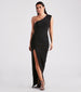 Elia gives off an aurora of dreamy sultriness sure to captivate at rehearsal dinners and red carpets! She features a sleeveless one-shoulder neckline, a wide strap with a shoulder pad for structure, and a form-hugging slim silhouette with a ruched seam leading to her high-cut slit. The formal dress is composed of a smooth and stretchy knit fabric with lining. Style with a rhinestone bracelet and heels to complete your dressy look!