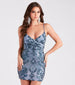 Create a picture-perfect fairytale look in the stunning Ella sequin bodycon dress! She features a sleeveless V-neckline with a wrap-front design, adjustable spaghetti straps for a customized fit, and a short, form-hugging silhouette. The sheer mesh fabric includes a full knit lining and all-over blue sequins with a pretty iridescent hue embroidered in a vintage-inspired scroll pattern. Style this dress with clear heels.