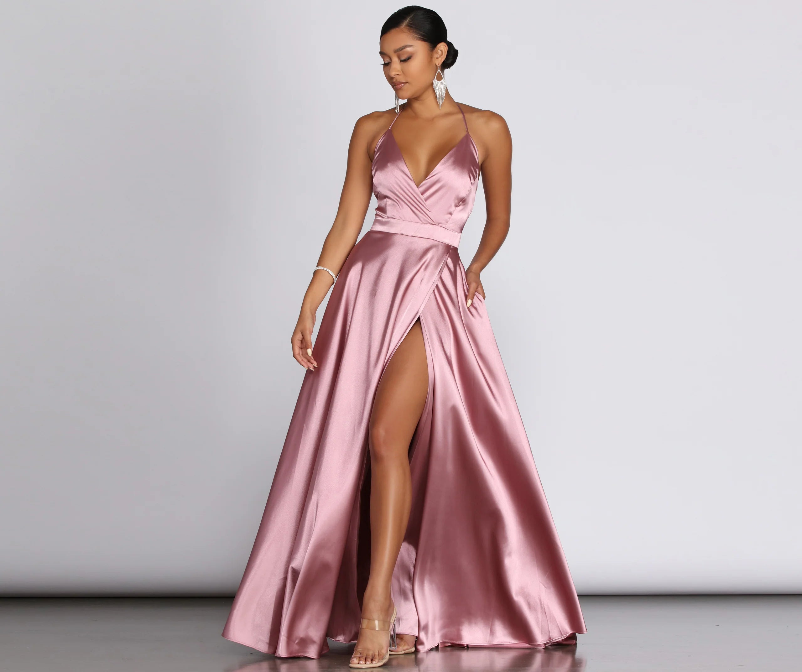 From the moment you enter the room, Ellie captivates and charms. She features a sleeveless bodice, a plunging V neckline with neck tie straps, vertical princess seams at the bust and a partially open back. Her slim fit bodice leads to a sweeping floor length silhouette accented with a high side slit to show off a hint of skin and hidden side pockets. Dress is composed of a lined satin fabric that offers a form hugging fit with minimal stretch. Includes a lower back zipper closure.