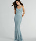 Create a princess moment at prom or your next formal affair in the Elowyn ruffle-back glitter mesh mermaid dress! Crafted with a stretchy sheer glitter mesh fabric with a full-length knit lining, this glitzy style is the enchanting dress of your dreams! Her sleeveless bodice is shaped with a V-neckline and adjustable spaghetti straps that lead to her bold open back with a cross-back strap design. Turn heads with her whimsical ruffled detailing that cascades down the length of the dress, adding glam allure to her curve-hugging mermaid silhouette. Complete your look with a luxe jewelry set and rhinestone heels.