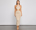 Embrace the summer vibes in this chic curve-hugging dress! It features a sleeveless halter neckline, an open back, a center knot detail with dual waist cutouts, and an ankle-length, form-fitting silhouette. Style this dress with sleek hoop earrings.