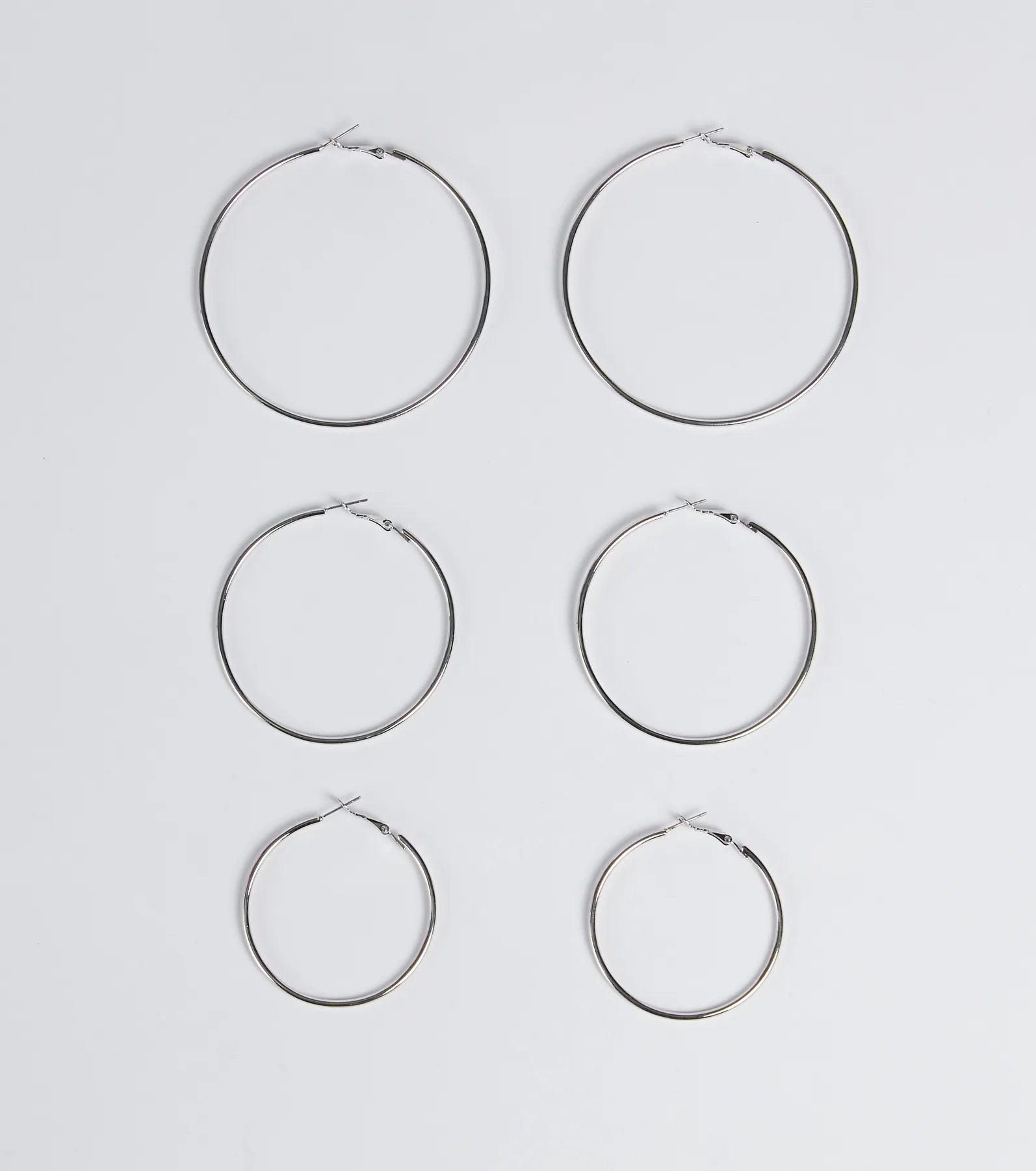 The perfect three-pack hoop earrings set you'll love styling on rotation! The set features multiple sizes of hoops with a sleek design and an omega closure. Complete the look with a chic handbag and heels.