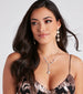 This ethereal chic rhinestone lariat necklace will step up the glamour of your formal look! It features a front design with mini rhinestones, teardrop-shaped rhinestones, and a center lariat with a large rhinestone accent. The back features a cascading lariat design with an adjustable slider and mini rhinestone embellishments. Style this necklace with a backless formal dress for a gorgeous vibe.