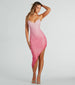 You'll be radiating eye-catching energy in this glitter ombre midi dress perfect for dates or parties when you want to shine! The midi-length dress boasts a V-neckline, adjustable spaghetti straps, a side ruched seam, and bodycon silhouette designed to hug your curves, and is finished with an asymmetrical-cut hem. Complete the look in bock heels and earrings!