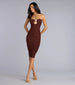 When the dress is the jewelry. This halter midi dress hugs your curves with side ruching and makes a bold statement with sleek hardware detailing along the neckline.
