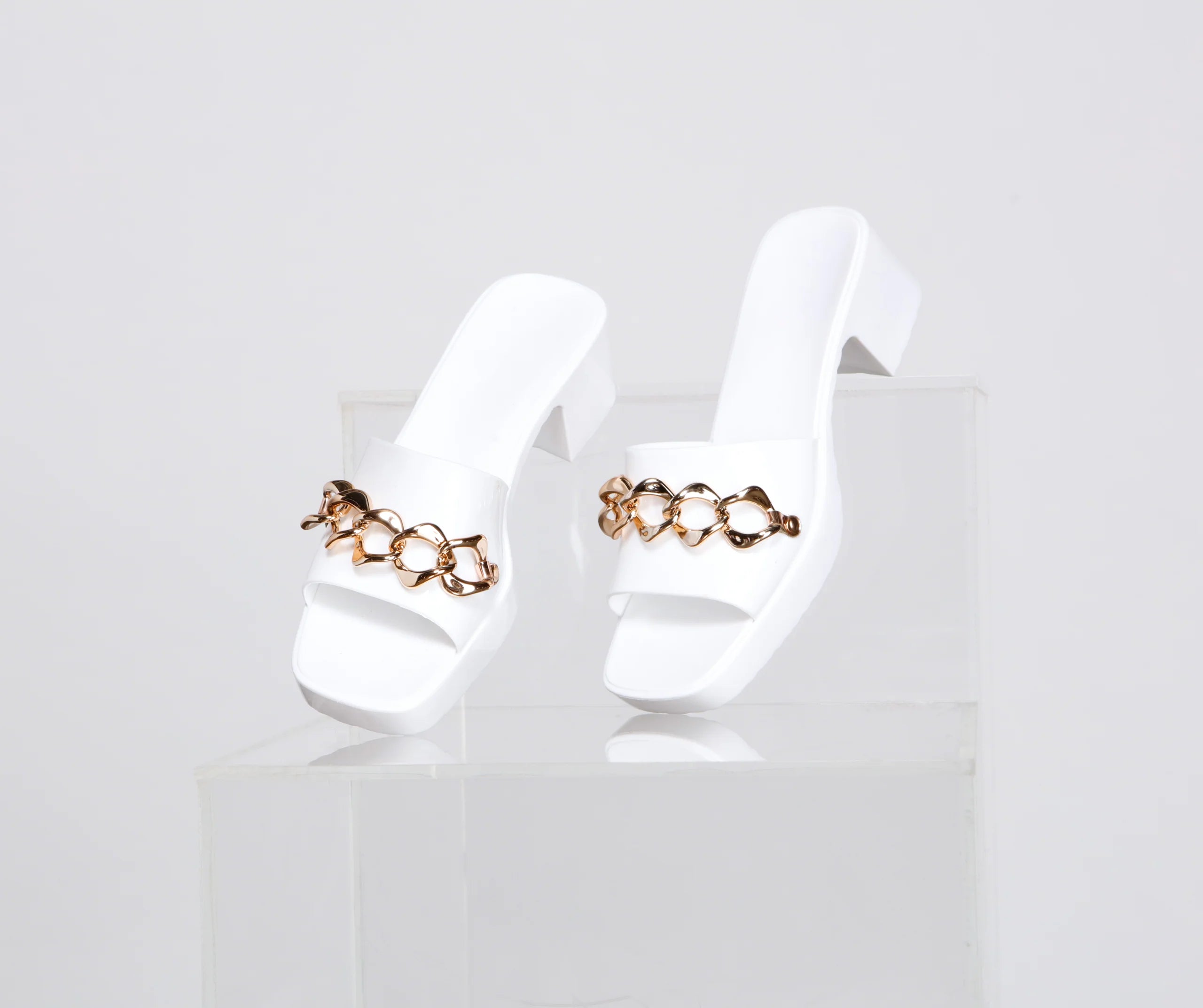Keep it fab and fierce with mules that bring the heat to your look! The mules feature an open back, an open square toe, a wide strap over the toe with a chainlink accent, and a low block heel. The mules are composed of a jelly material Complete look with a matching top and skirt set.