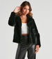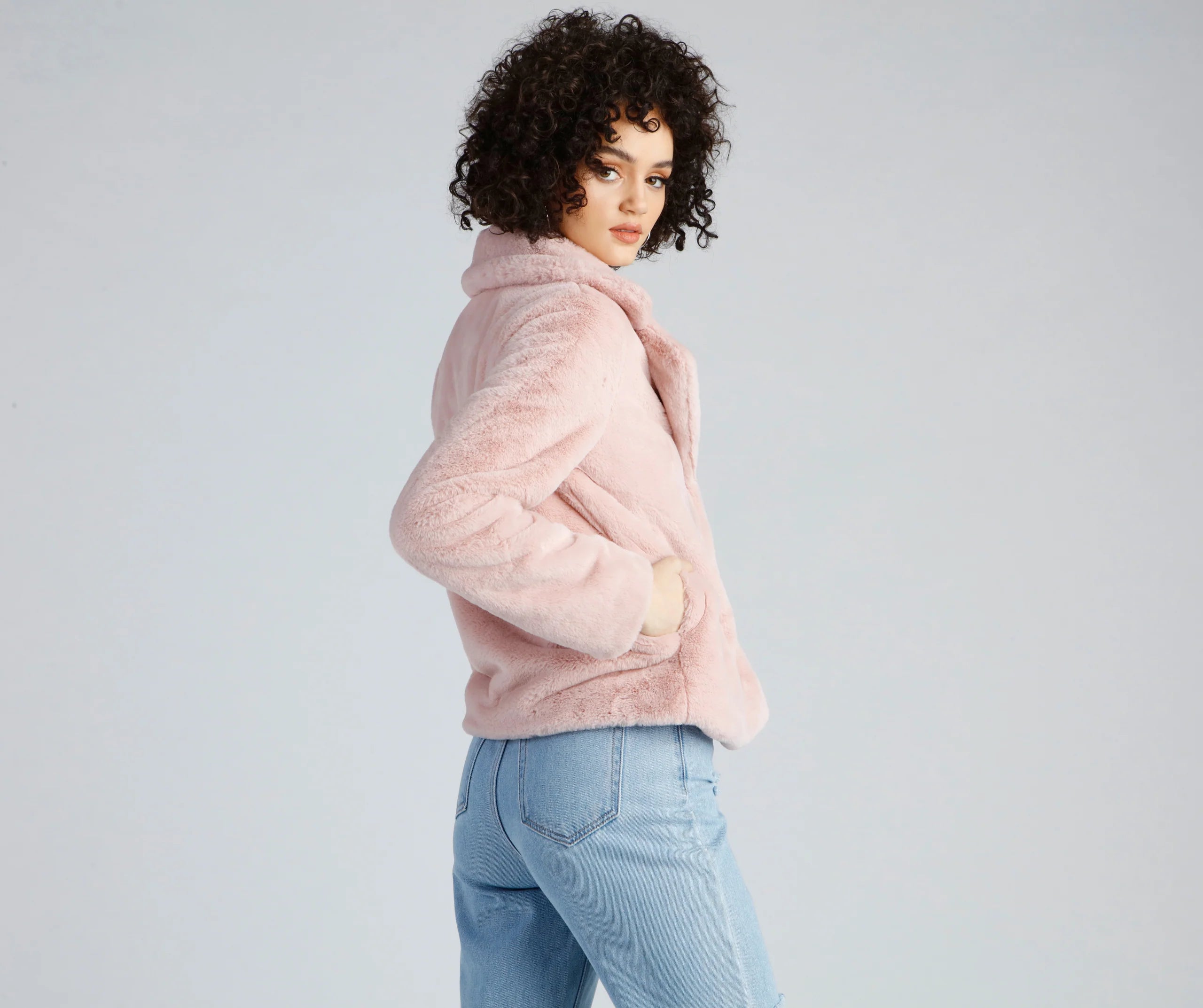 Live out that glam life with a jacket that elevates your cold-weather outfits. The jacket features a collared neckline with a lapel accent, a multi-snap button closure, long sleeves, lined side pockets, and a mid-length hem. The jacket is composed of a lined faux fur fabric that offers a relaxed fit with minimal stretch. Complete look with boots.
