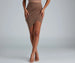 Highlight your sultry figure in this chic ruched mini skirt perf for girl's night! It features a high-rise waist and a front ruched detail on the asymmetrical style hem. Composed of a smooth, slinky-knit fabric with a moderate stretch. Style with trendy booties.