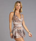 This animal print mini dress was made for turning heads. With its draped cowl neckline, strappy halter fit, and flouncy layered hem, it’s a party dress with untamed vibes.