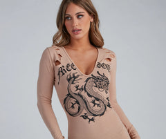 Keep it fiercely bold with a mini dress that slays! The dress features a V-neckline, slashed detailing, an image of a dragon, text that reads: 'Free Soul', long sleeves, and a mini-length silhouette. The dress is composed of a cotton knit fabric that offers a form hugging fit with a moderate stretch. Complete look with a moto jacket and booties.
