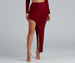 This skirt is a must-have for making that stunning first impression! The skirt features an elastic high rise waist, ruching throughout, a high side slit, and a maxi length hem. The skirt is composed of a lined smooth knit fabric that offers a form-hugging fit with a moderate stretch. Complete the look with the matching crop top.