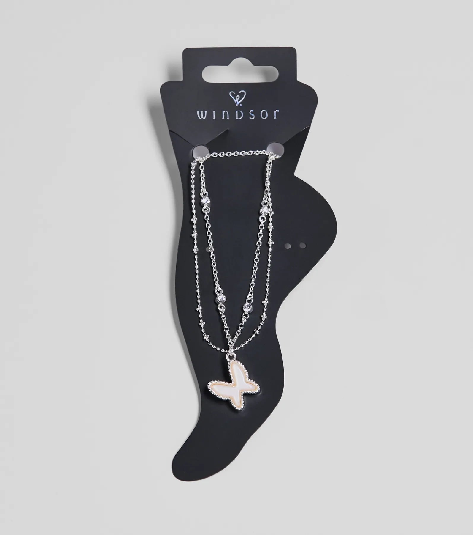 Flirt and flutter! This charming three-pack anklet set features two dainty anklets and one anklet with rhinestone trim and a butterfly charm. Each has a lobster clasp closure. Complete the look in a whimsical skater dress.