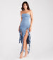 Captivate them with your flirty attitude in this on-trend ruffled midi dress! Featuring a strapless straight-across neckline, a fitted bodice with ruched side seams, a midi-length hem with dual high-cut side slits, and ruffled trims and accents, this dress is perfect for a summer party. The buttery-smooth knit fabric offers plenty of stretch. Style with a rhinestone choker necklace and lace-up heels.