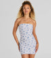 Keep your summer date 'fits flirty and stylish with this floral eyelet strapless mini dress! The airy lightweight eyelet knit fabric is detailed with a sweet ditsy floral print and features a brushed knit lining for coverage. The mini-length dress is shaped with a strapless straight-across elasticized neckline for added stretch and a bodycon silhouette to highlight your curves. Pair with platform sandals and hoop earrings.