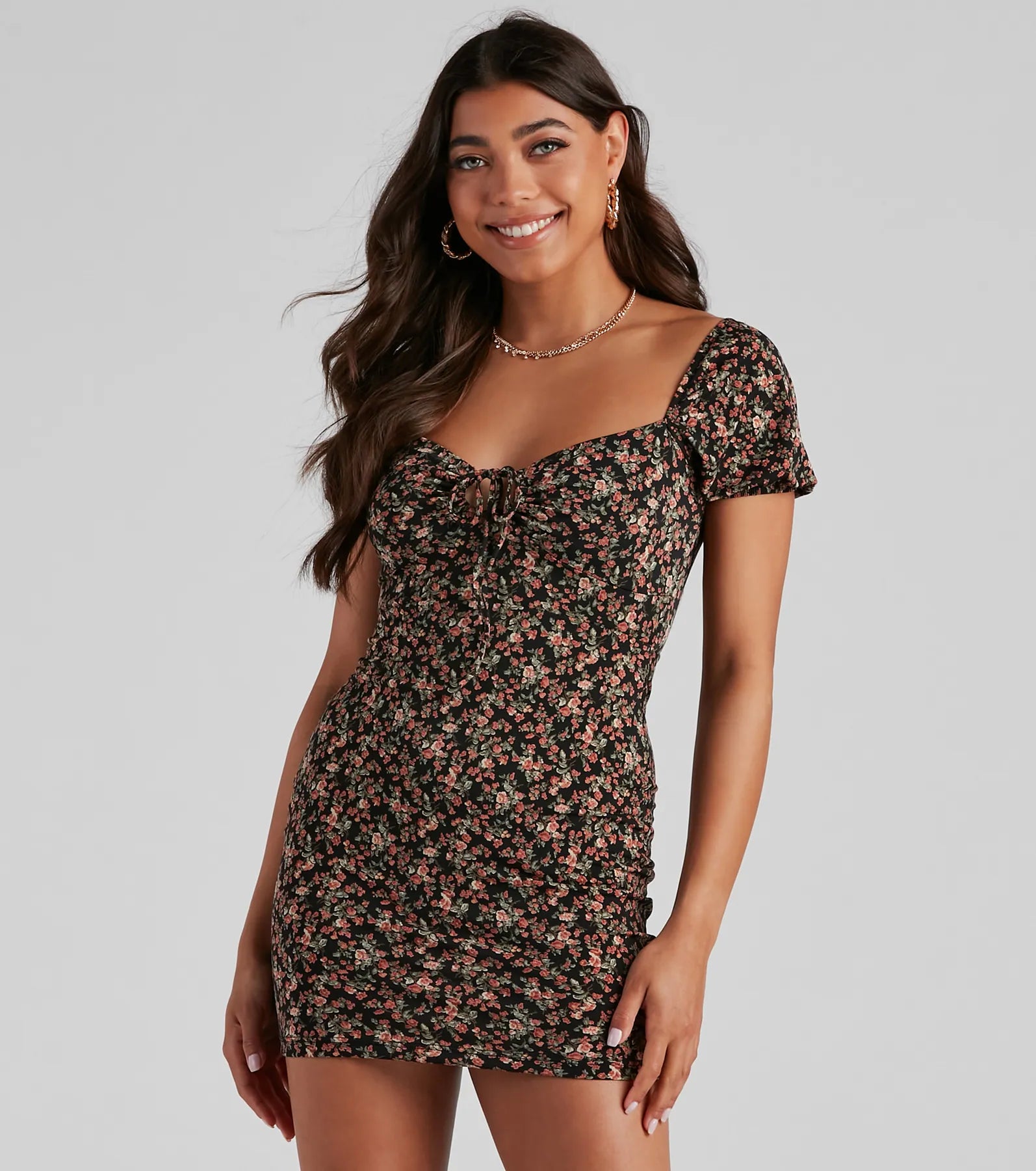 Heading to an afternoon soiree? This floral mini dress is perfect! It features adorable short puff sleeves, a sweetheart neckline, a front bust tie with a keyhole accent, and a bodycon silhouette. Complete the look with a crossbody bag.