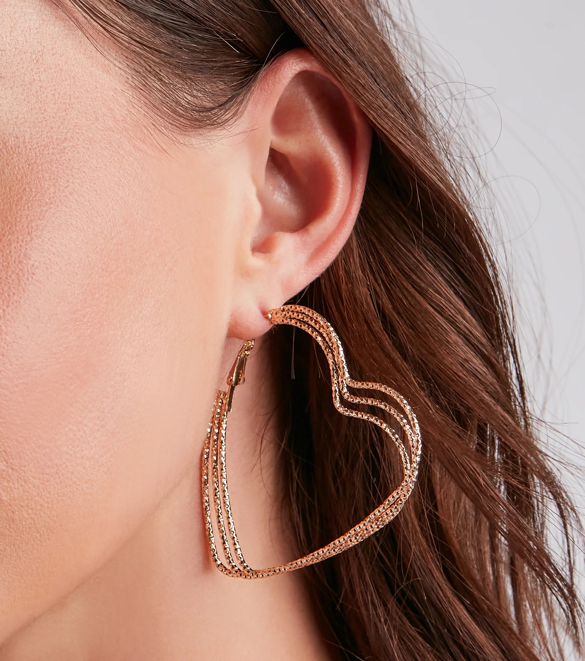 Follow your heart and add some glamour to your look with these adorable hoop earrings! They feature a layered design of three heart-shaped metal outlines with textured detailing. Style with a flirty cropped blouse and a satin midi skirt.