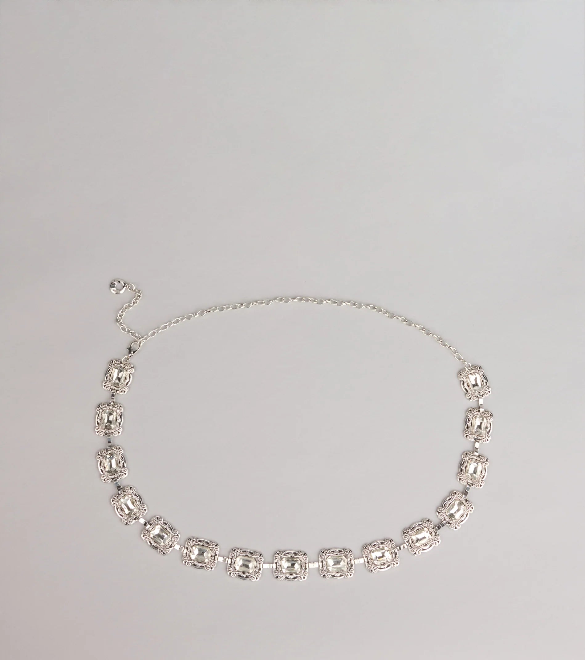 Big shine, zero subtlety. This etched square chain belt with oversized gemstones was made to steal the spotlight and cinch every 'fit with bold glam energy.