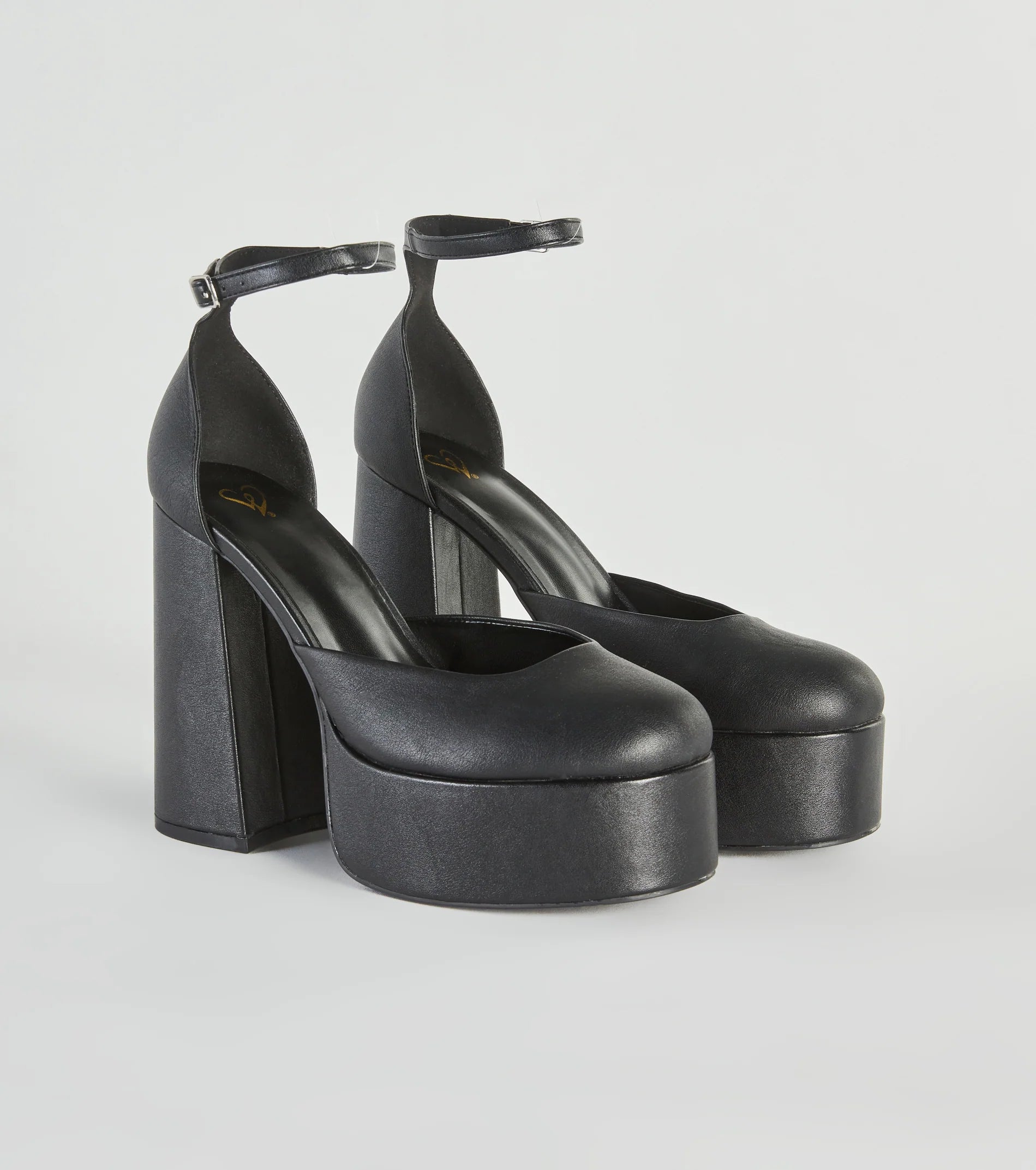 These chic of-the-moment platform pumps will garner all the attention! They feature a closed almond toe, a closed back, a thin adjustable ankle strap, a bold platform sole, and an ultra-tall block heel. Style with a sleek clutch for your next night out.