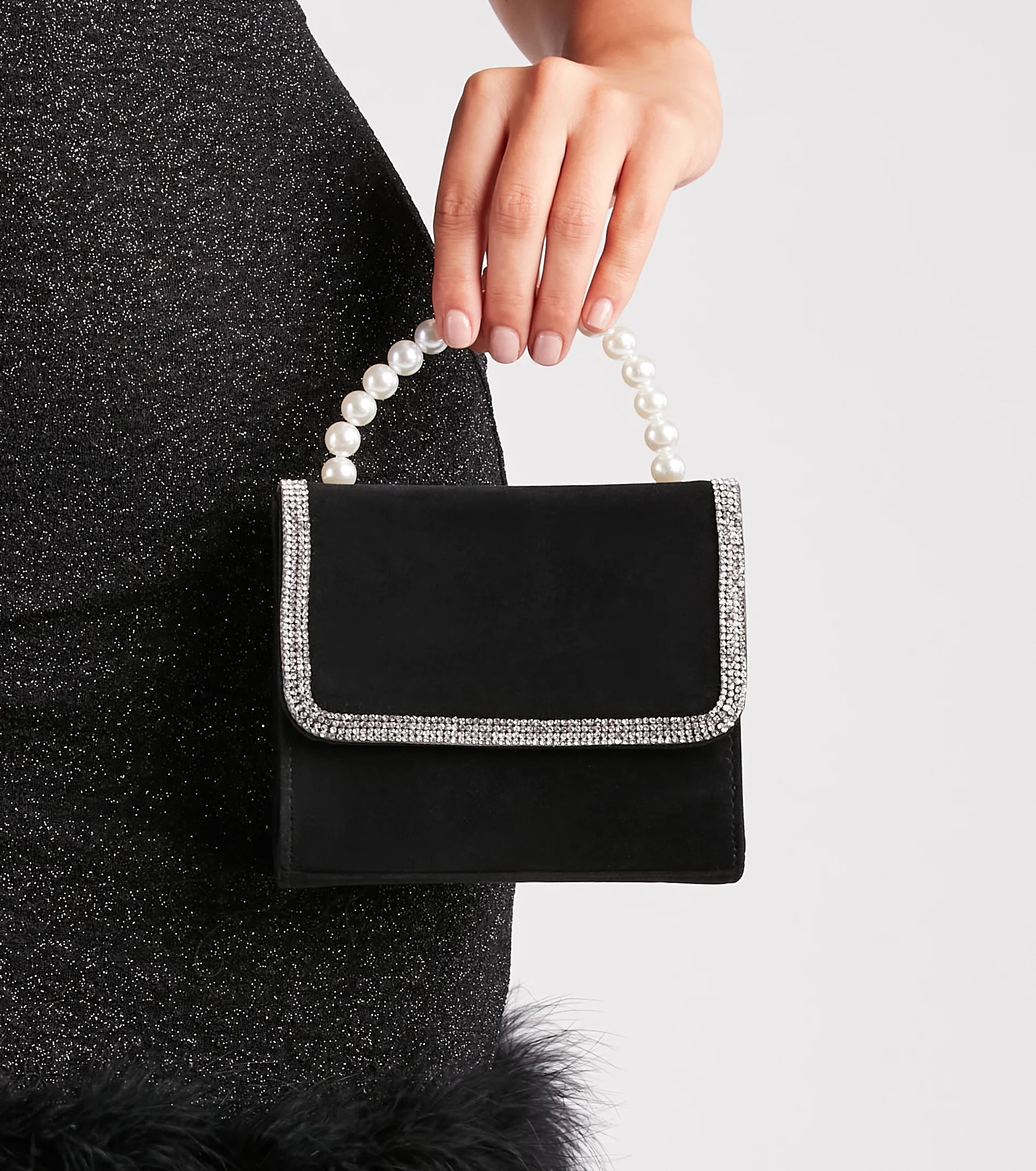 Make your next night out a glam affair with this chic velvet mini handbag. It features a mini square-shaped design with a fold-over flap, snap-button closure, a sparkling mini rhinestone embellished trim, a faux pearl top handle strap, and a detachable metal chain-link shoulder strap. The handbag has a spacious lined interior with a pocket to keep your essentials close by. Style with a glitter dress and stiletto heels!