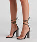 Make your exit so glam in these faux suede heels featuring an almond toe, PVC toe strap, rhinestone embellished block heel, and a lace-up design. Complete the look in a sultry dress for a girl's night.