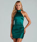 Raise the heat looking glam in this satin party dress for a night at the club or birthday party! Featuring a sleeveless halter mock neckline with dual back button closures, a pleated side seam, and a flattering bodycon silhouette and mini-length hem. The smooth satin fabric offers a moderate stretch. Complete the look with a sparkly bracelet and heels.