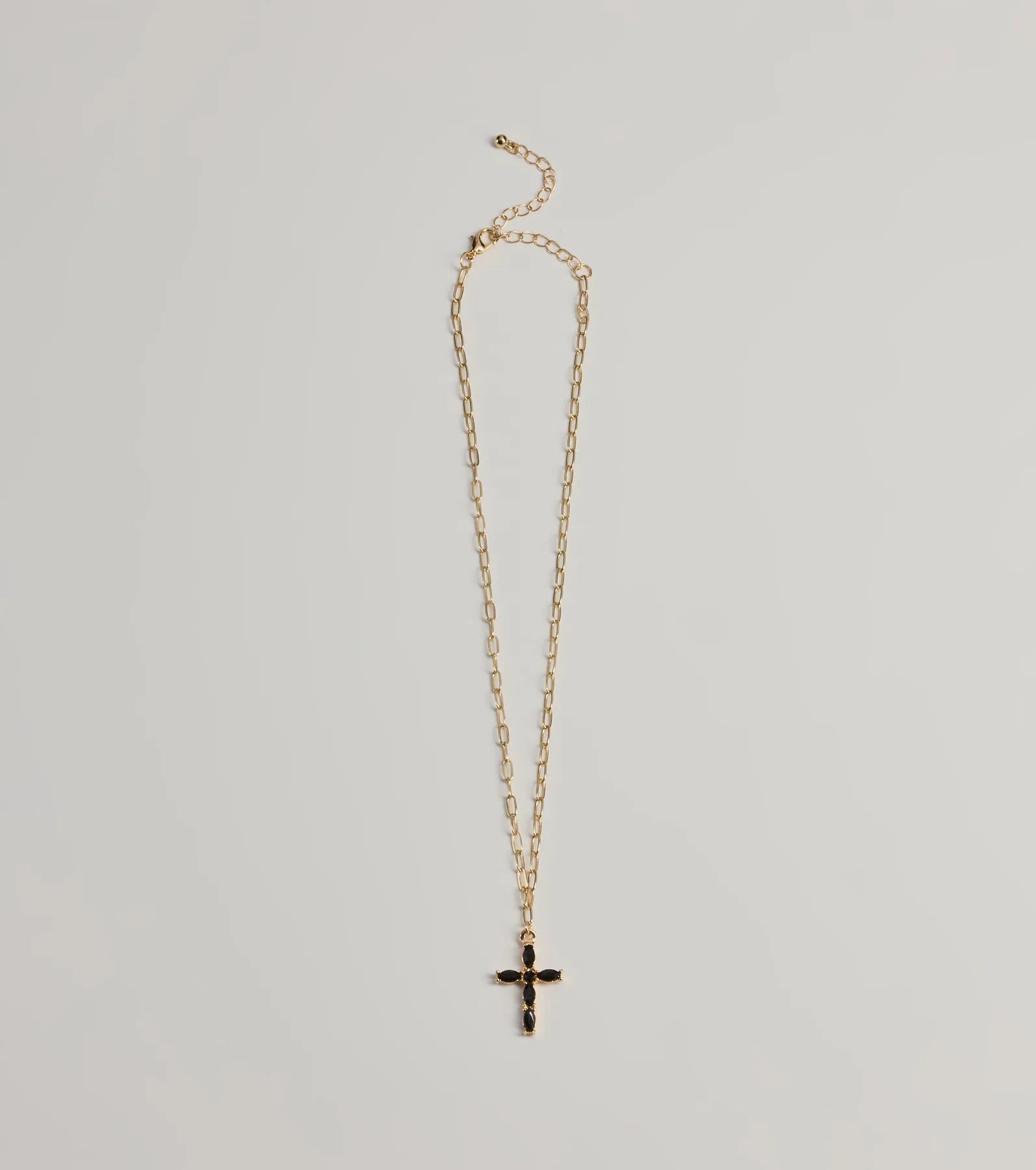 Add a glam trendy style to your everyday look with this chain necklace featuring a cross charm embellished with pretty gemstones. Pair with hoop earrings.