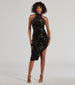 Glam up your rooftop party look in this velvet midi dress with a metallic foiled floral pattern for a gorgeous sheen. It features a sleeveless mock neckline, a partially open back for a chic allure, a high-cut side slit to showcase some leg, and a mid-length bodycon silhouette to flaunt your curves.