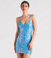 Give off a glamorous glow that will catch all the glances in this stunning sequin mini dress! It features a sleeveless V-neckline, spaghetti straps, an open back with a lower lace-up strappy design, a mini-length hem, and a bodycon silhouette that will hug your curves. The iridescent sequins are embroidered in a luxe scroll pattern that will create a gorgeous shine. Style with a rhinestone jewelry set.