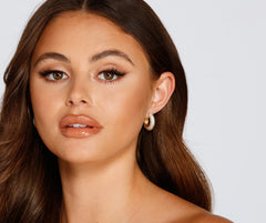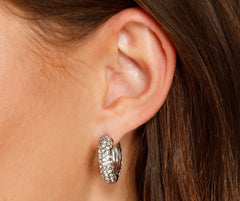 Shine on like the diva you are with a pair of chic huggies. The huggies feature mini rhinestones throughout and a post-back closure. Complete look with a black jumpsuit and heels.