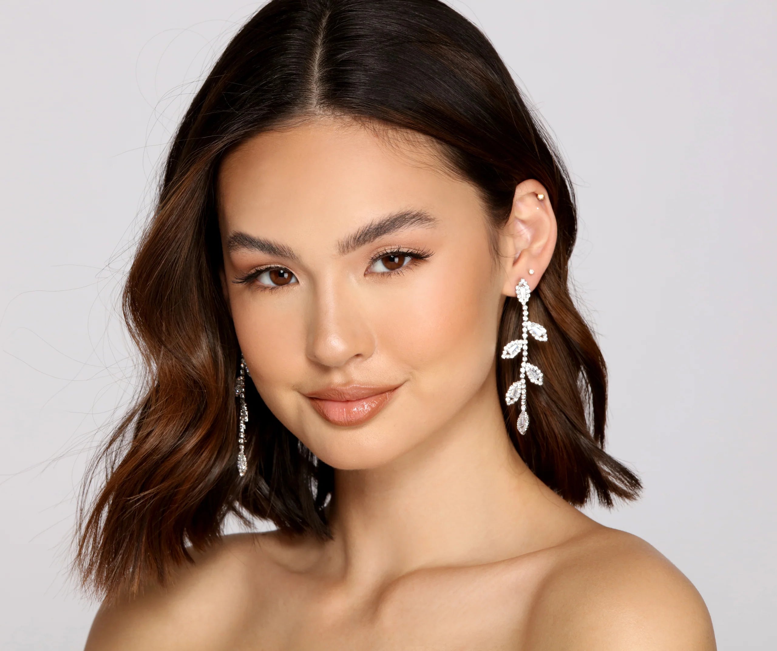Create a glamorous moment with earrings that reflect your luxe style. The earrings feature a liner rhinestone leaf design and post-back closure. Complete look with a satin dress and heels.