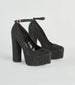 Show up and stun like the glamour queen you are in these glitzy and bold rhinestone platform pumps! They feature a closed almond toe, a thin adjustable ankle strap, a closed back, a chunky platform sole, an ultra-tall block heel, and all-over mini rhinestone embellishments. Style with a glitter mesh clutch to turn heads on your next night out.