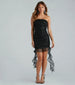 Gleam with all the glitz and glamour in this ruffled glitter party dress! It features a strapless straight-across neckline, all-over ruching, a mini-length ruffled hem, trendy cascading ruffled side trims, and a bodycon silhouette that will show off your curves. The glitzy sheer glitter mesh fabric includes a lining. Complete your gorgeous party look with rhinestone heels!