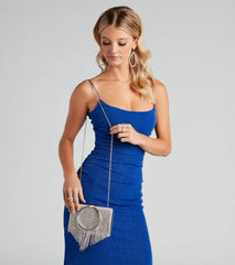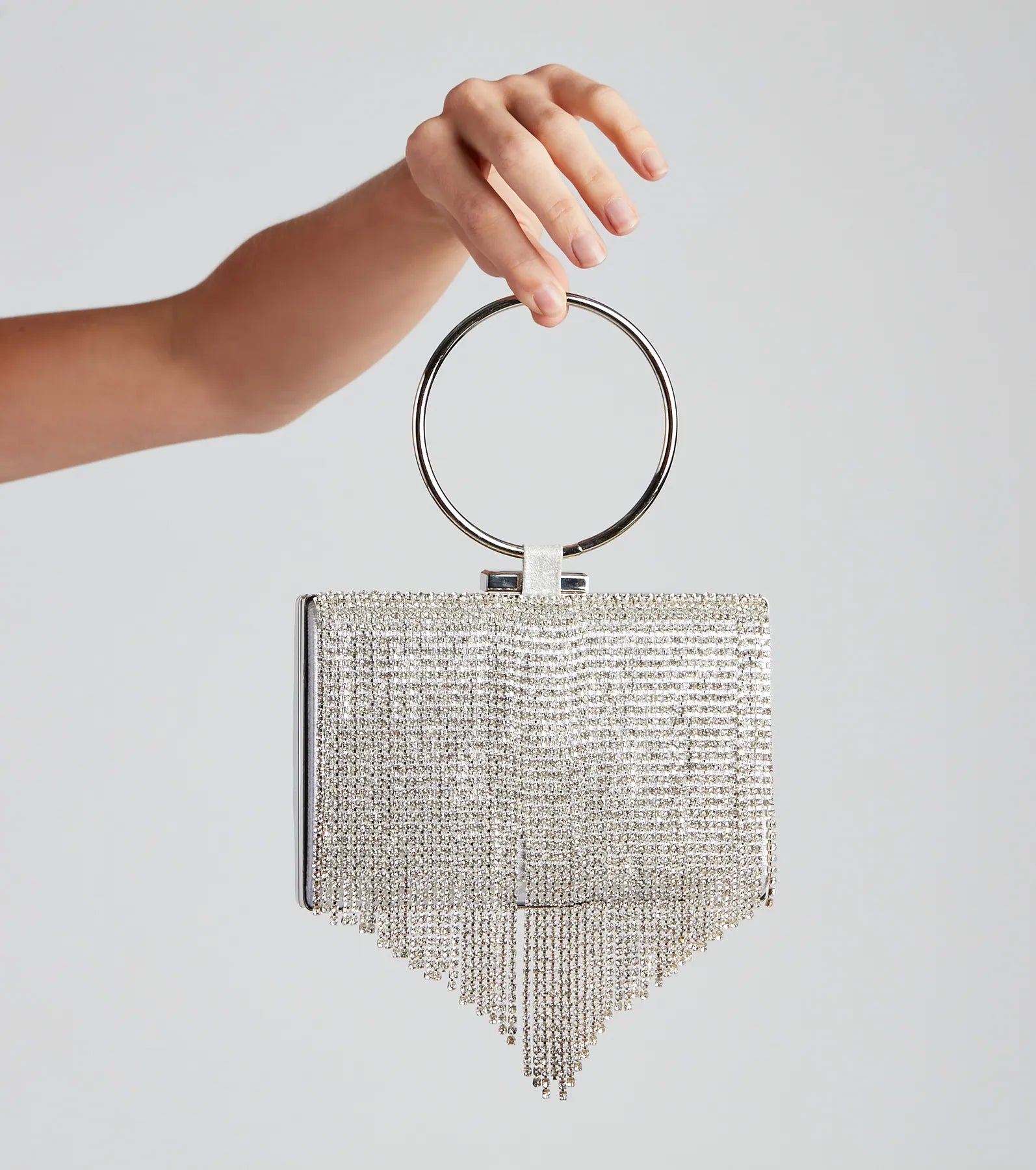 Heading somewhere glamorous? This box clutch is the perfect accessory to adorn your dressy look! It features a sleek, o-ring handle, detachable chain link strap, rhinestone fringe, top snap closure, and a spacious interior. Style with a dainty ring set.
