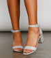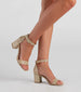 Get a glitzy and gorgeous vibe with these glam block heels. They feature an open almond-shaped toe with a strap, an adjustable ankle strap, a comfortable low block heel, and a sparkly glitter mesh exterior. Style these heels with a cute skater dress and an embellished clutch.