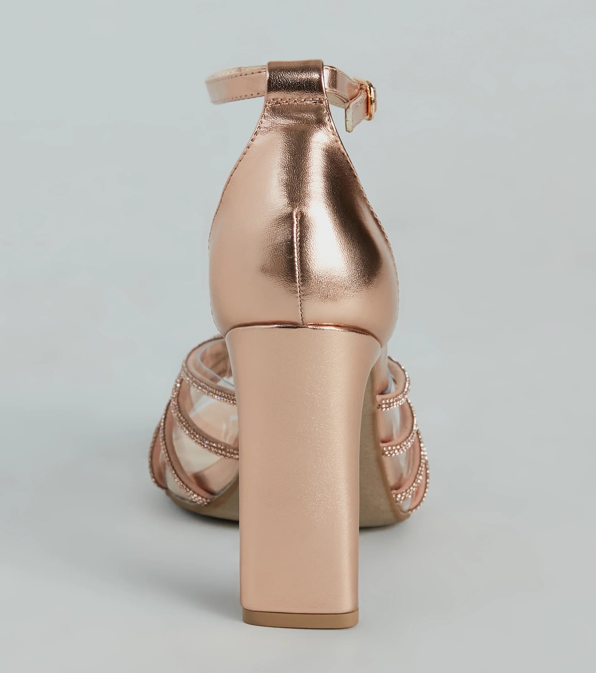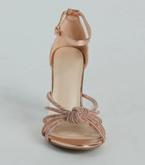 These rhinestone strappy metallic heels will put you in a glitzy mood for your dressy affair! They feature an open almond-shaped toe, a glam knotted strappy design with mini rhinestones layered over a wide clear PVC strap, a thin adjustable ankle strap, a closed back, and a sleek thin block heel. The faux leather material features a trendy chrome sheen for that extra shine. Style with rhinestone hoops!
