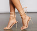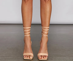 Chase that glow with heels that sparkle up your night! The heels feature lace-up straps, an open square toe with a single strap over the toe, and a rhinestone embellished stiletto heel. Complete look with an LBD.
