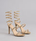 Let your glow shine through in these eye-catching stiletto heels featuring a rhinestone embellished spiral design, pointed toe, on a chrome sole. Complete your look in a short party dress for a dressy night out!