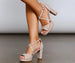 Glow on with heels that add that extra sparkle to your look! The glitter heels feature closed-back, adjustable cross-ankle straps, a peep toe, a wide platform, and a block heel. The heels are composed of a glitter mesh material. Complete look with a bodycon and rhinestone clutch.